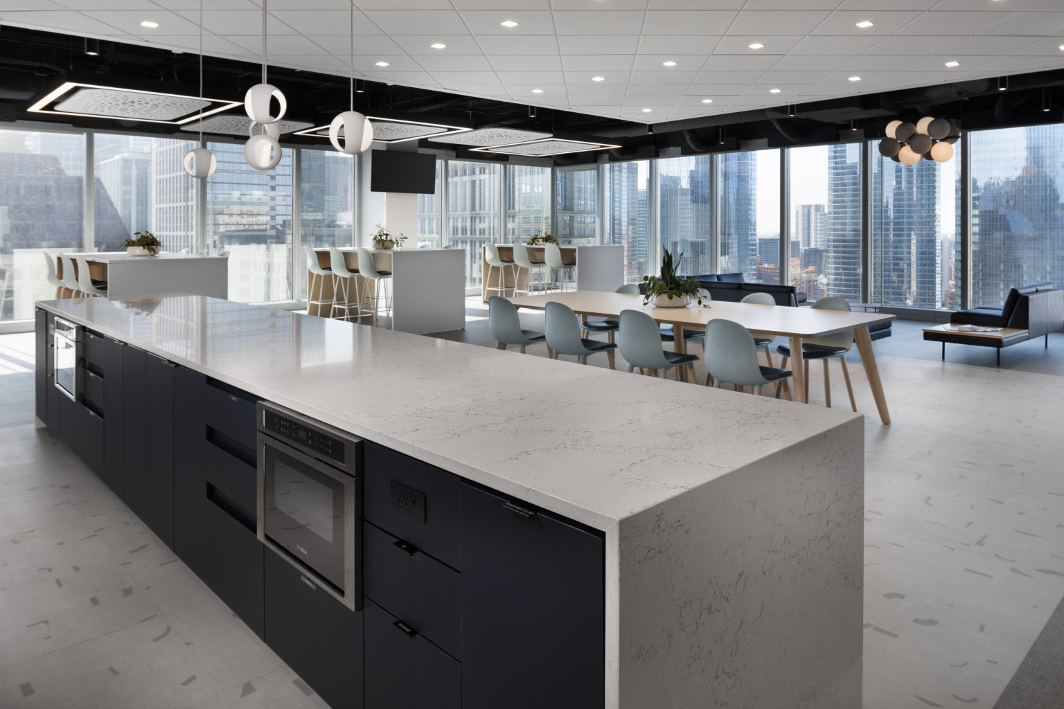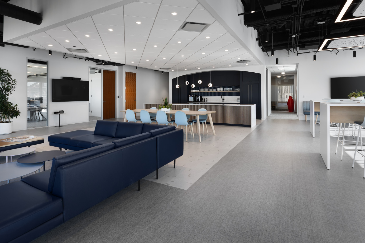 Initially positioned in the corner of the floorplate, the redesign focused on establishing a strong elevator identity, reimagining the arrival sequence, and refreshing the guest experience. The original reception area was transformed into an expanded community space, setting the tone for a welcoming and dynamic environment. Key design elements emphasized maximizing views and natural light to foster an open and airy atmosphere while strategically reducing the density of heads-down workspaces. Conferencing areas were isolated to ensure security and privacy, presenting a new, forward-thinking image for the firm. The new layout also promotes employee well-being with generous kitchen and seating areas, as well as dedicated phone and wellness rooms.