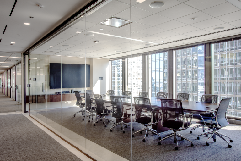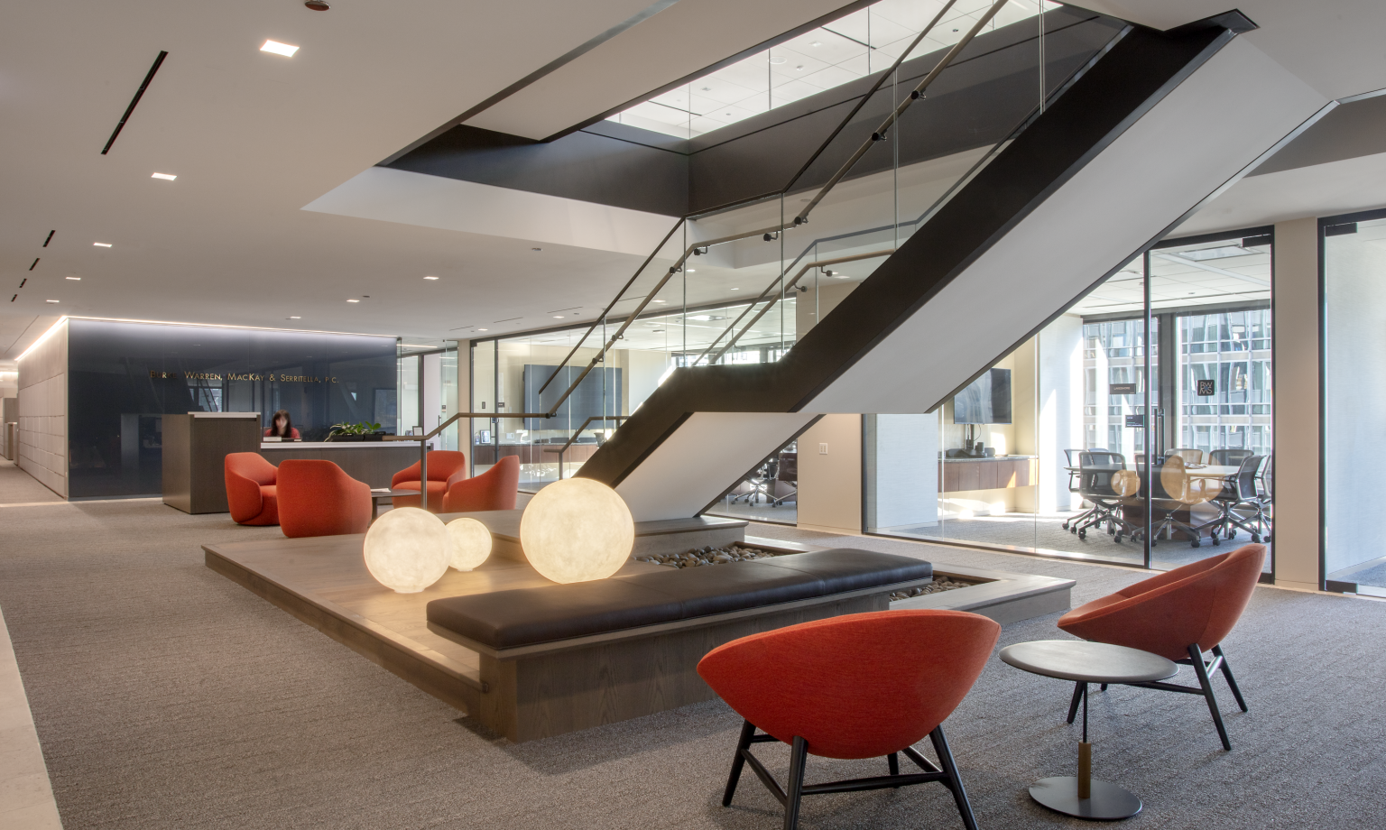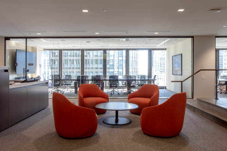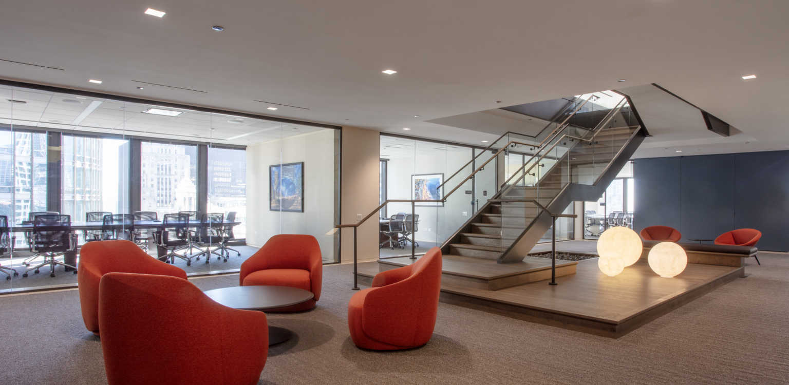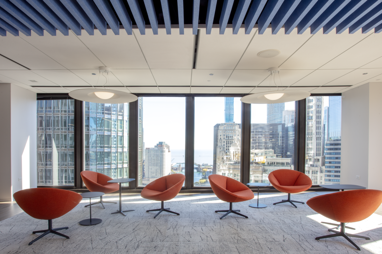 Located at 330 N Wabash Ave in Chicago, this 49,561-square-foot workspace was thoughtfully designed to support a full-service law firm with nearly 70 attorneys. The office balances privacy and collaboration with a layout featuring 70% private offices, 5% open workstations, 15% conference areas, and 10% communal spaces. Unique design elements, including felt baffles made from recycled materials, wood flooring, and a connecting stair with steel framing and wood cladding, combine functionality with aesthetic appeal. Continuous glass office fronts with sliding doors create a modern, open feel, while lacquer millwork elevates the conference center.