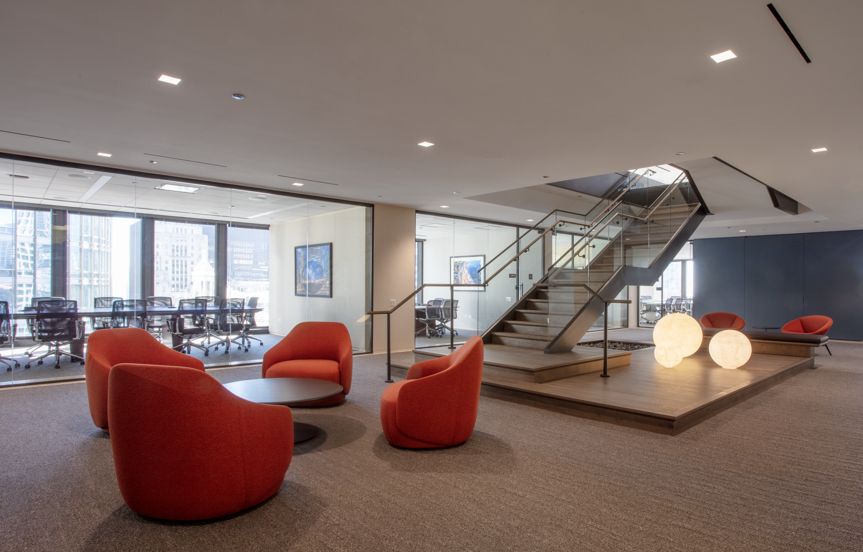Located at 330 N Wabash Ave in Chicago, this 49,561-square-foot workspace was thoughtfully designed to support a full-service law firm with nearly 70 attorneys. The office balances privacy and collaboration with a layout featuring 70% private offices, 5% open workstations, 15% conference areas, and 10% communal spaces. Unique design elements, including felt baffles made from recycled materials, wood flooring, and a connecting stair with steel framing and wood cladding, combine functionality with aesthetic appeal. Continuous glass office fronts with sliding doors create a modern, open feel, while lacquer millwork elevates the conference center.