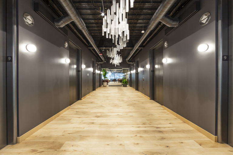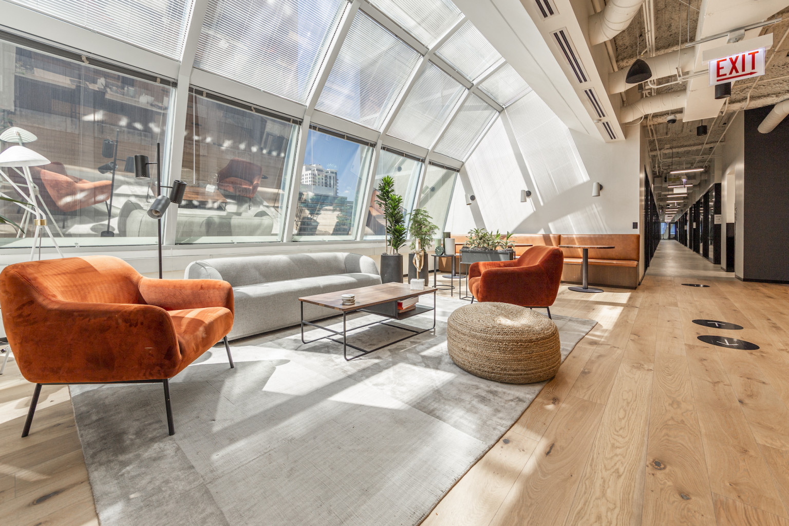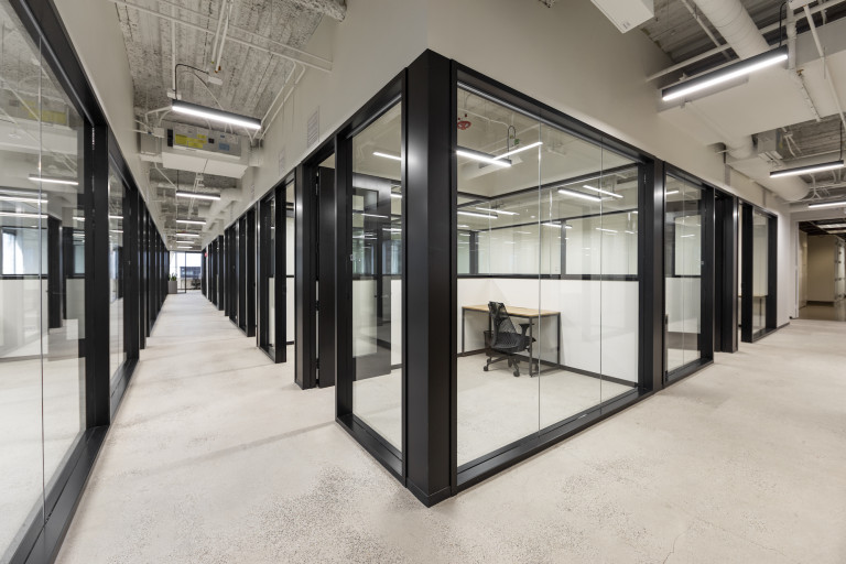 Connected by an inter-floor staircase, the office design boasts elegant millwork, wall finishes and lighting. Wood flooring throughout connects multiple conference rooms, lounges, private offices and multipurpose areas that were built with custom drywall partitions and glass fronts.