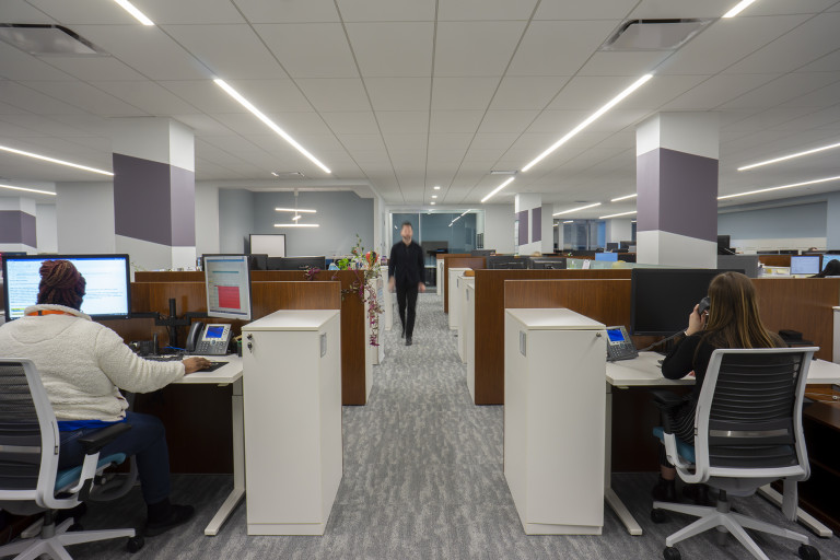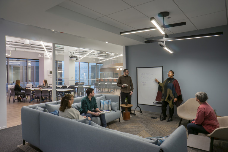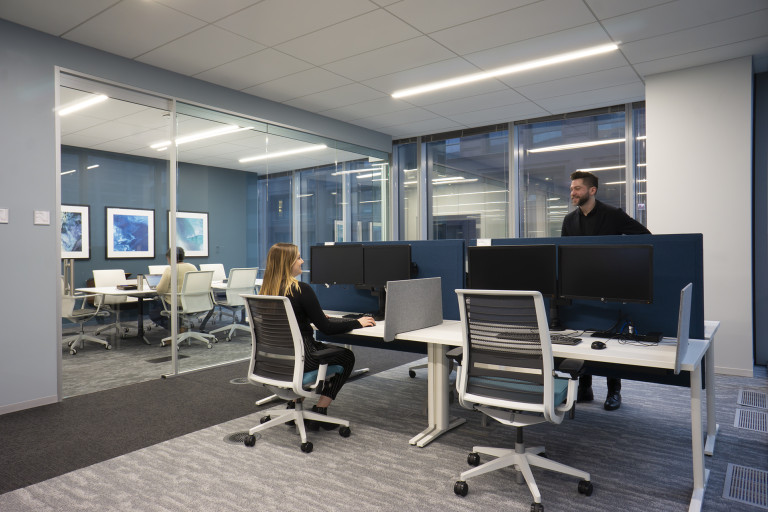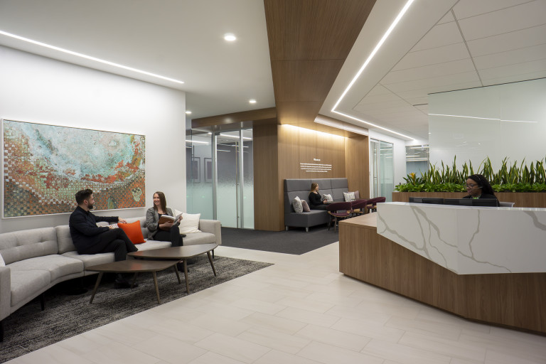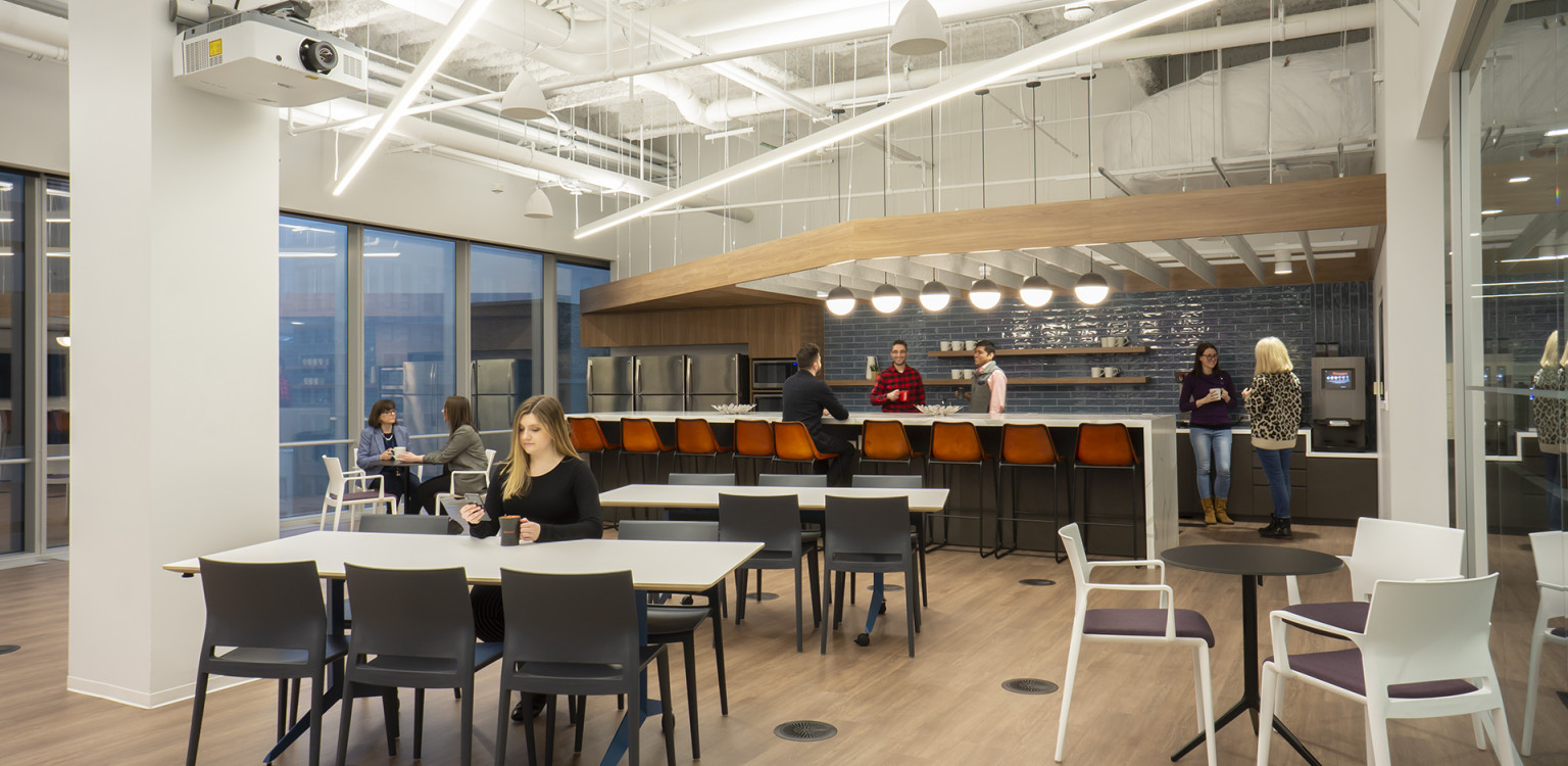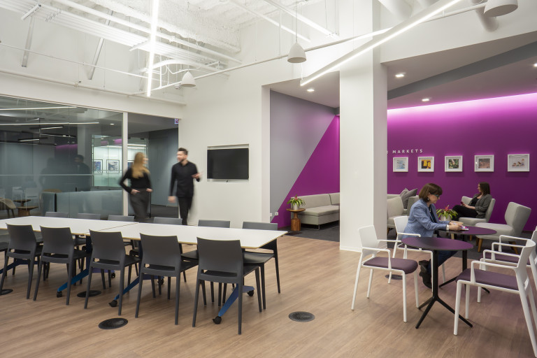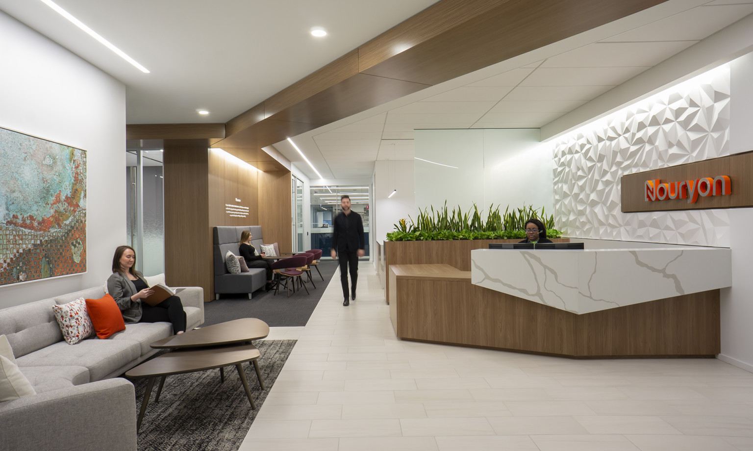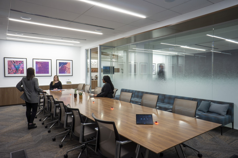 This 40,000 SF collaborative workplace was built on raised floors and combines open office areas with convenient private work spaces and conference rooms. Full-height glass walls, custom ceiling millwork and wall graphics combined with wired, and wireless, technology throughout showcase Nouryon’s brand. The space, designed by Partners By Design, evokes today’s best-in-class contemporary corporate environment.