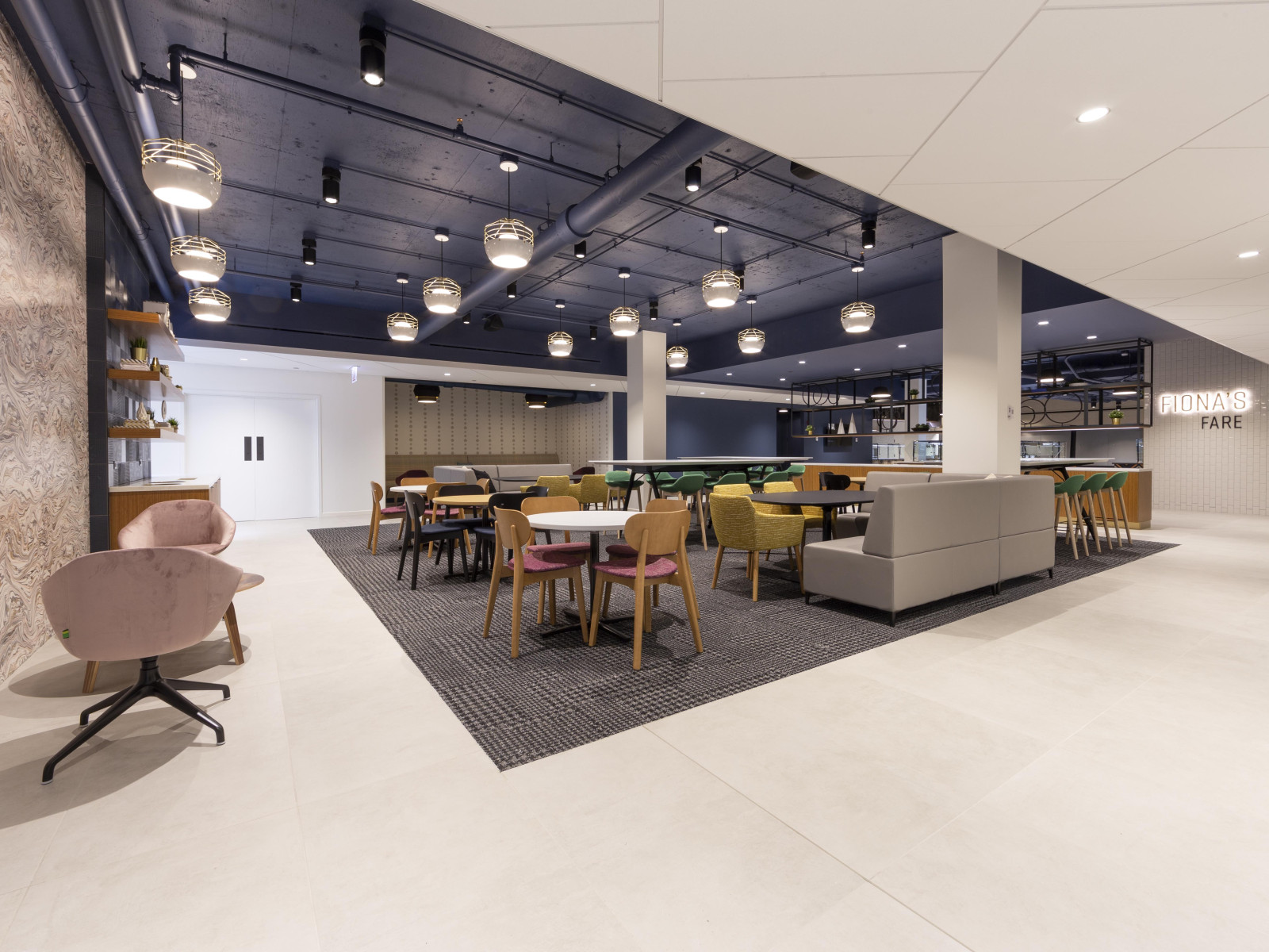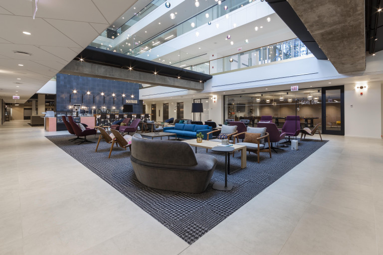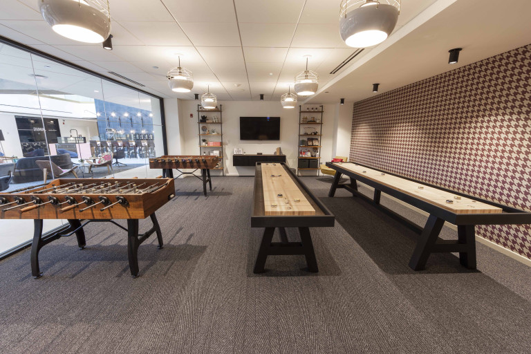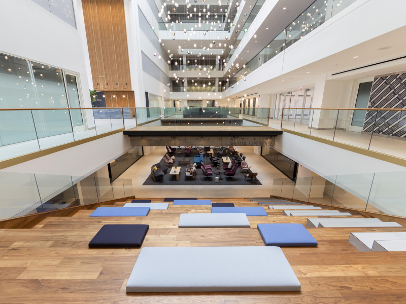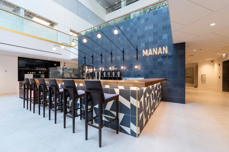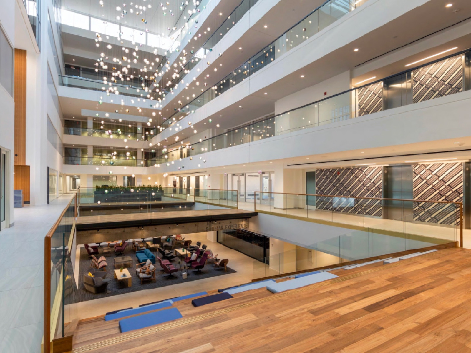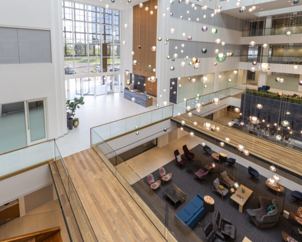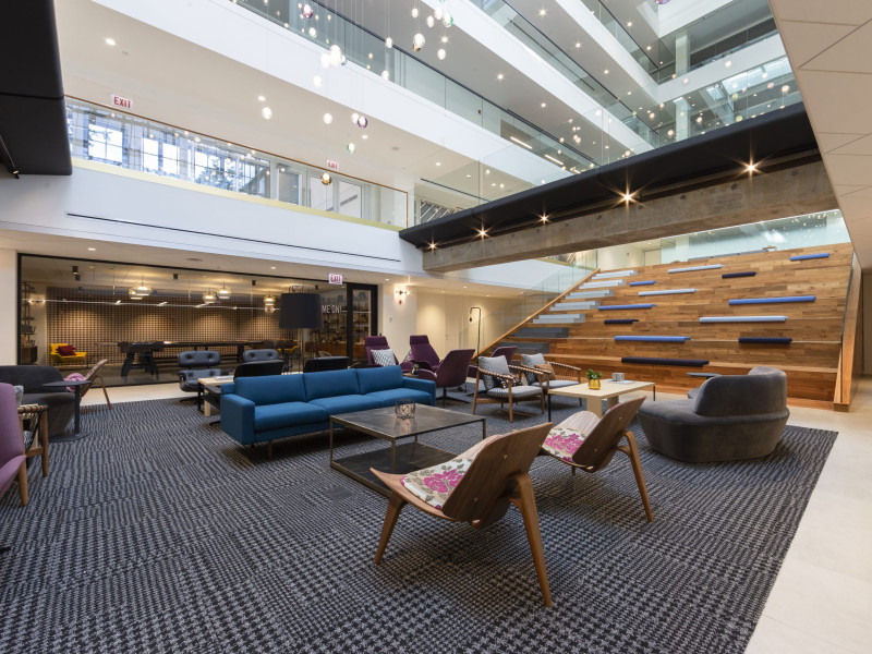 The 35,000 SF project consisted of an elevated redesign of the main building entrance, lobby and atrium, that leads down to a bright, airy lower level featuring a barista bar, a market-style deli, state of the art fitness center, co-working lounges, and other amenities more typical of a Chicago highrise then the surrounding suburban offices. High-end finishes were added to enhance the main lobby and common areas, which amplifies the experience for tenants and their clients.