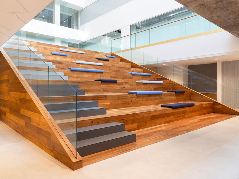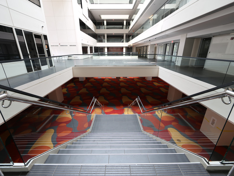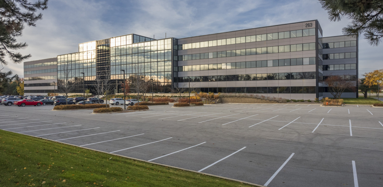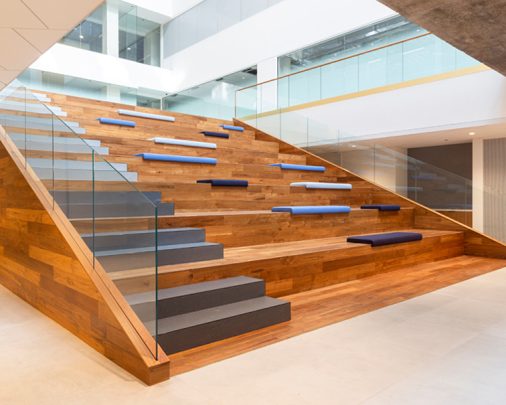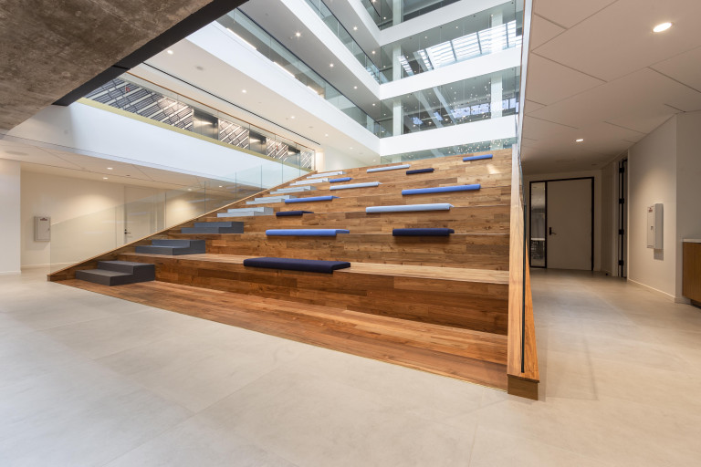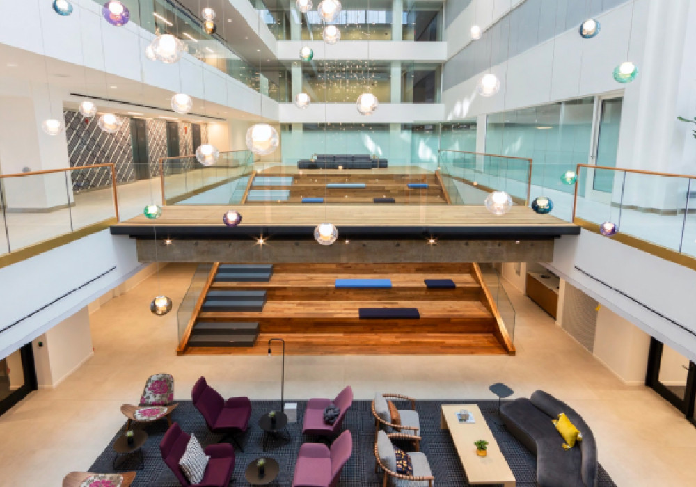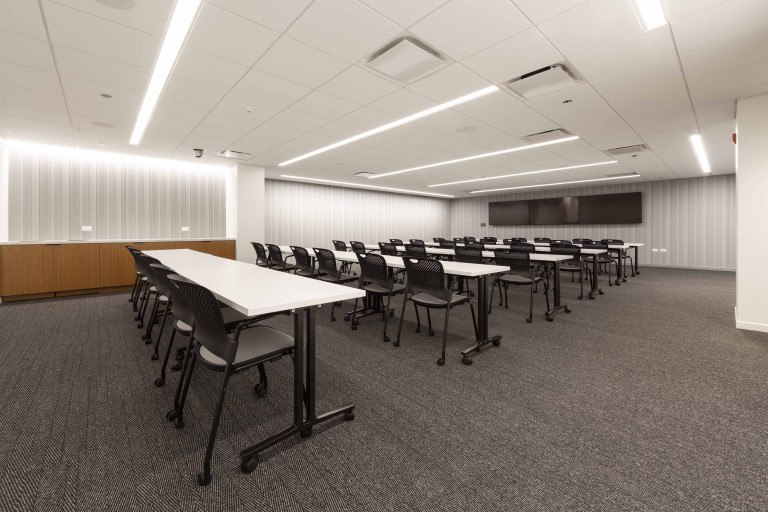 The 35,000 SF project consisted of an elevated redesign of the main building entrance, lobby and atrium, that leads down to a bright, airy lower level featuring a barista bar, a market-style deli, state of the art fitness center, co-working lounges, and other amenities more typical of a Chicago highrise then the surrounding suburban offices. High-end finishes were added to enhance the main lobby and common areas, which amplifies the experience for tenants and their clients.