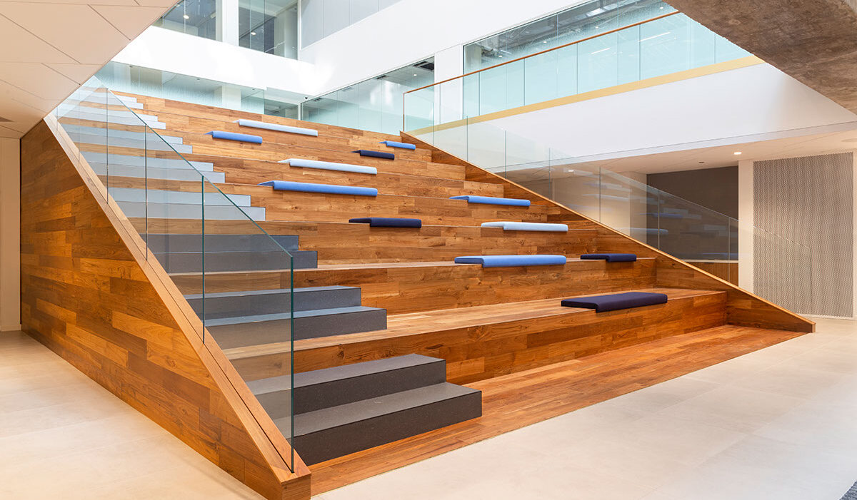 The 35,000 SF project consisted of an elevated redesign of the main building entrance, lobby and atrium, that leads down to a bright, airy lower level featuring a barista bar, a market-style deli, state of the art fitness center, co-working lounges, and other amenities more typical of a Chicago highrise then the surrounding suburban offices. High-end finishes were added to enhance the main lobby and common areas, which amplifies the experience for tenants and their clients.