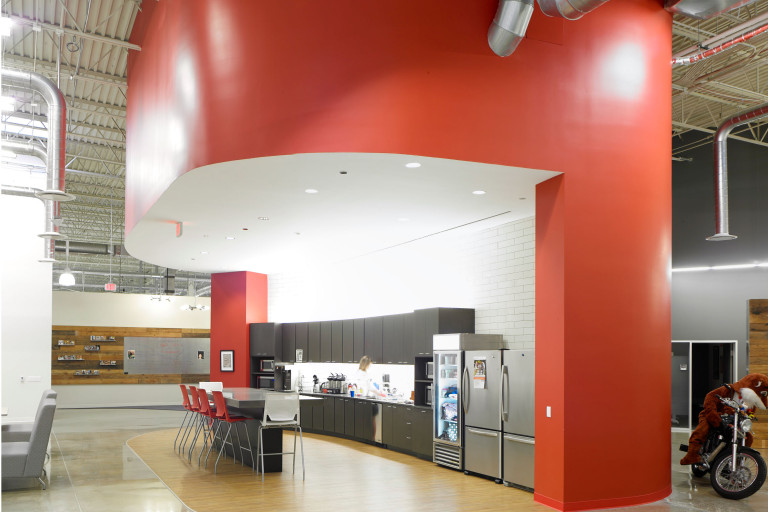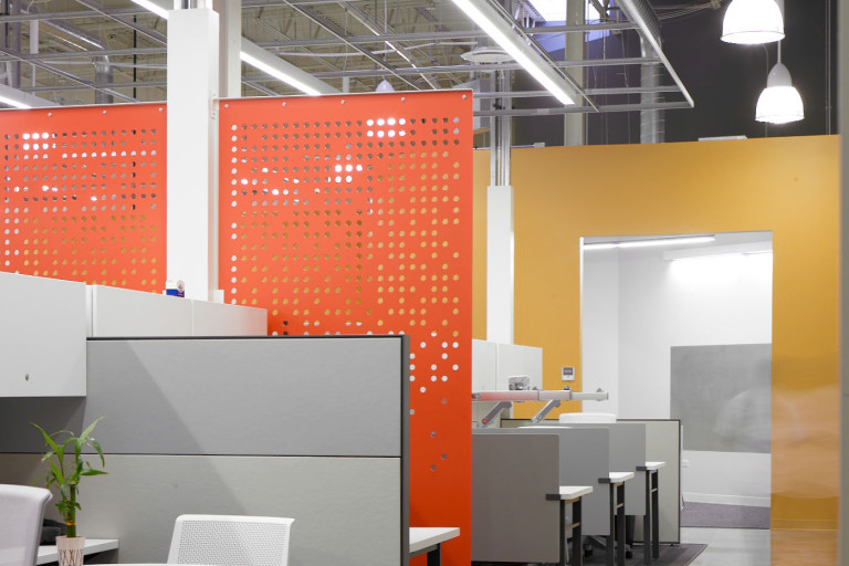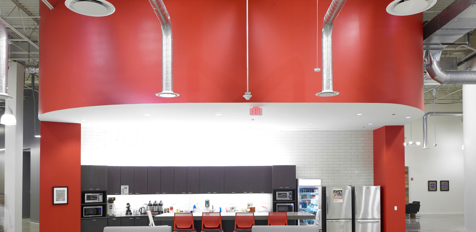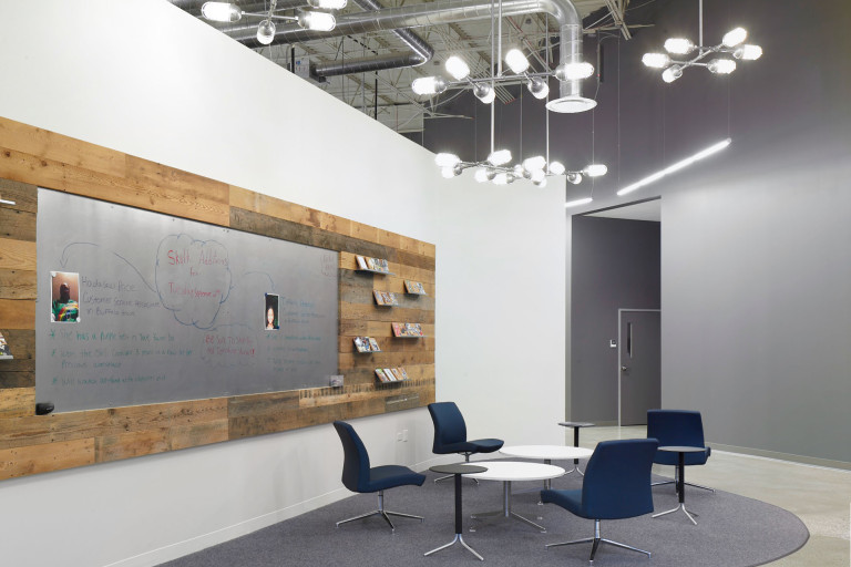 The office renovation features detailed millwork, including reclaimed barn wood wall panels at the reception, a call center, specialized training rooms, and an open office environment that fosters flexibility and teamwork.